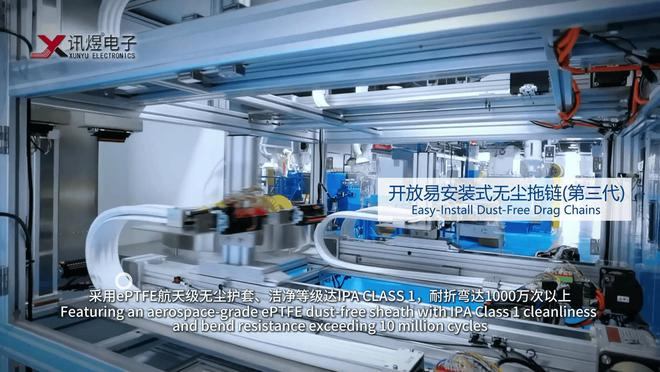 訊煜電子自主研發(fā)的耐折彎測試機(jī) 訊煜開放易安裝式無塵拖鏈,采用ePTFE航天級無塵護(hù)套、潔凈等級達(dá)IPA CLASS ONE,耐折彎達(dá)1000萬次以上,內(nèi)部采用高分子材料柔性線卡,更好地包裹和保護(hù)線纜、減小磨損,保障每根線纜的穩(wěn)定可靠運(yùn)行,同時提高了無塵拖鏈在高速運(yùn)行過程中的流暢度。支持多層疊加和龍骨支撐,滿足更多線纜集成和長行程應(yīng)用場景需求。